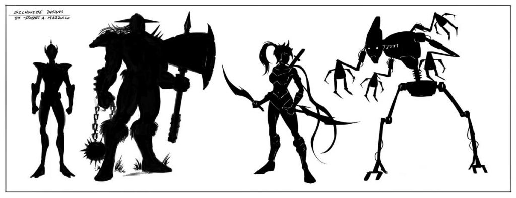 It matters because we are extremely good at spotting things based upon their silhouette. Don’t believe me? Have you ever seen Batman’s silhouette and thought it was Winnie the Pooh? Probably not likely. Also, a strong easy to read silhouette translates into a strong character design. This is one of the many reasons character designers use the power of silhouettes at the beginning of their creative process. It also allows for a fast workflow to developing ideas.
